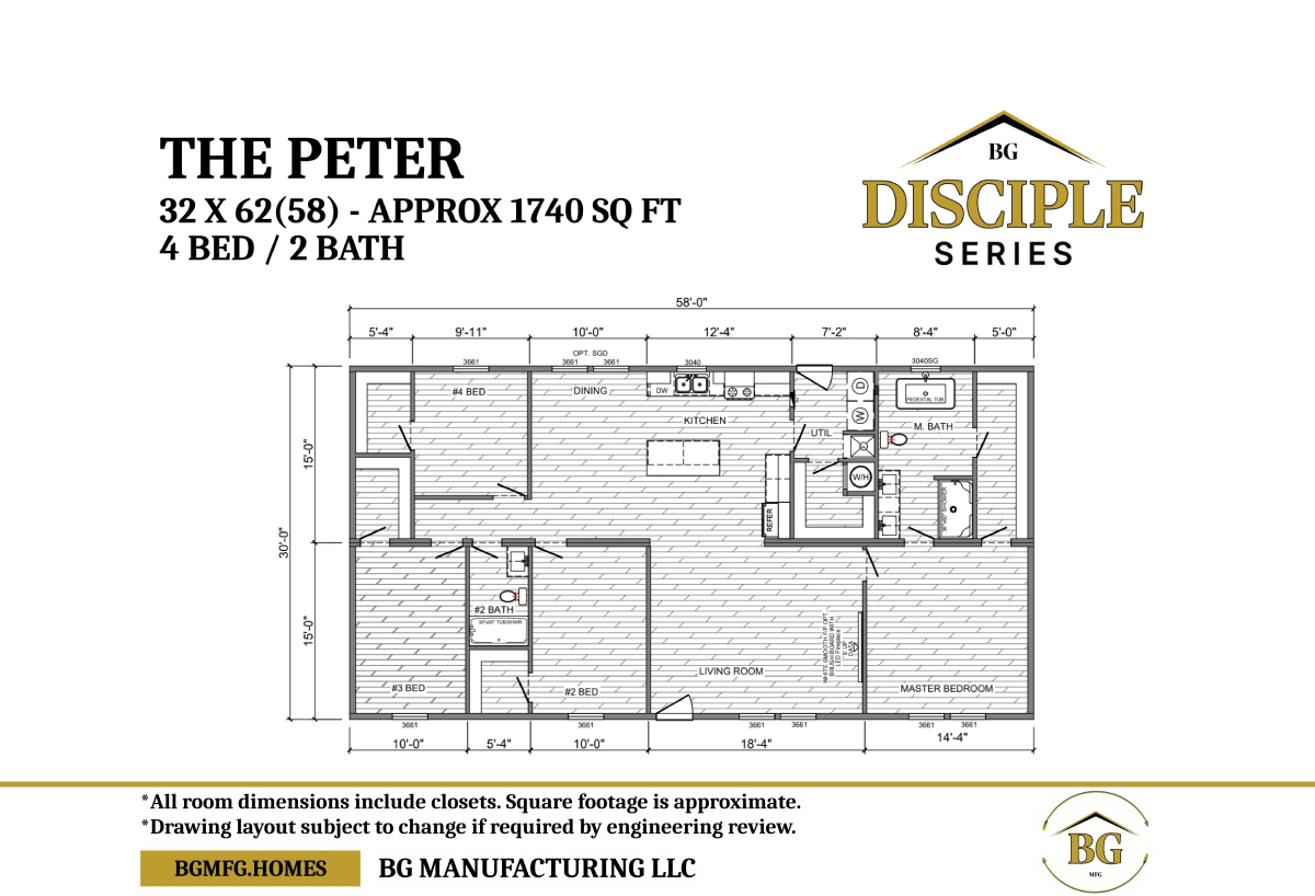 The Disciple Series / The Peter 58 built by BG Manufacturing features 1,740 sq. ft. of well-designed living space, offering 4 bedrooms and 2 bathrooms. The open layout connects a spacious living room, dining area, and modern kitchen with an island, creating the perfect space for gatherings. The master suite includes a large private bath, while the additional bedrooms provide flexibility for family or guests. The Peter 58 blends comfort, function, and modern appeal to suit today’s lifestyle needs.